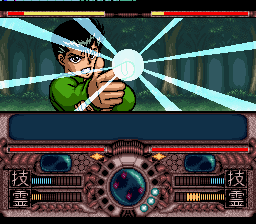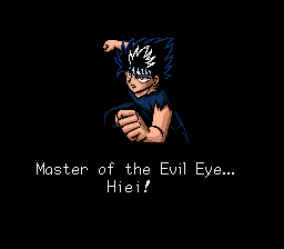 The first of two Yuu Yuu Hakusho cinematic fighting games for the Super NES. It's a damn good game, too, and it follows the story up through the big tournament on the island. I -believe- that Toguro 100% is the final boss, but don't quote me on that :) Anyways, you play by inputting commands and it shows your characters act them out on screen. Consider it to be a thinking-man's fighting game!